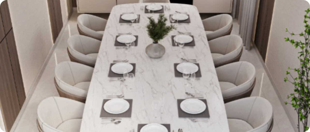 - الأنواع المتوفرة: غرف طعام مودرن، غرف طعام عائلية كبيرة، غرف طعام صغيرة عملية
